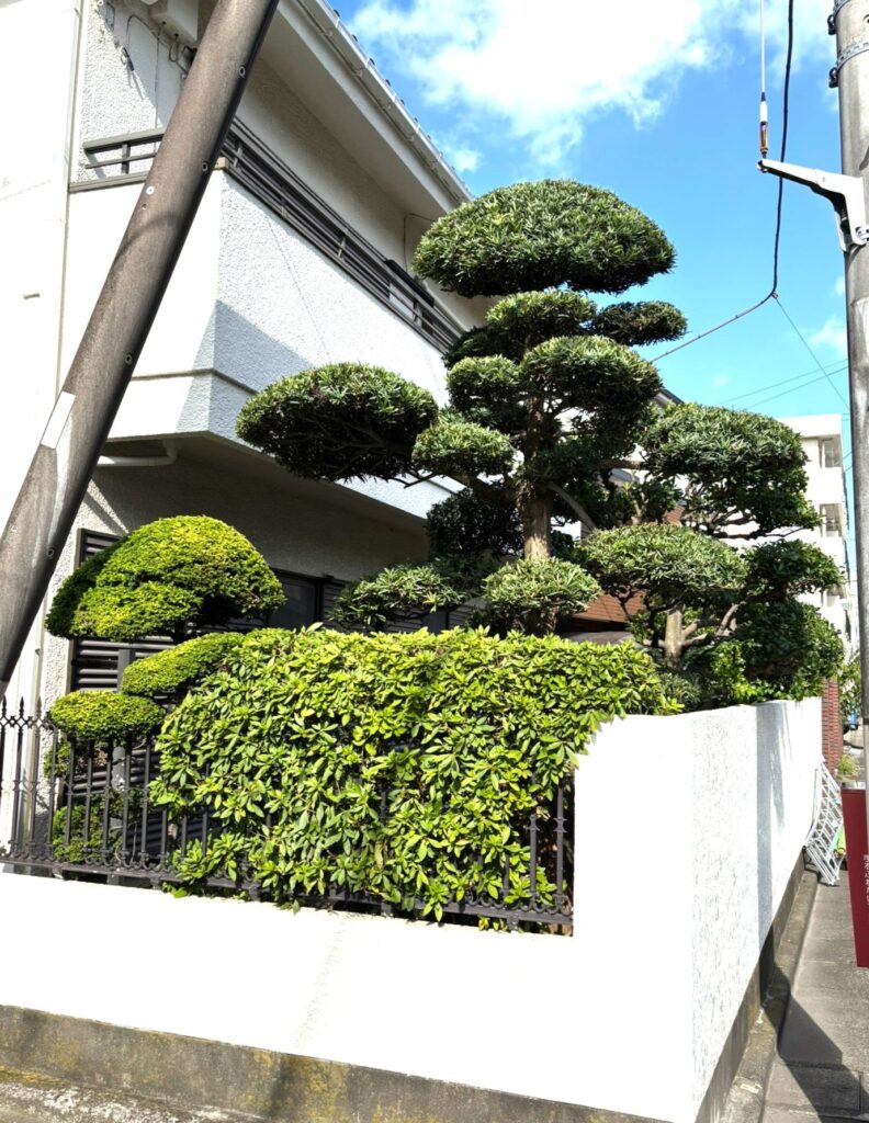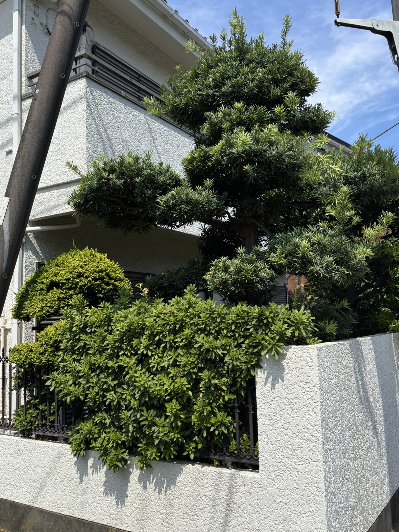 マキは太い枝が長く伸びており、ただ刈り込んだだけではその枝から芽が大量に発生しますので、対策として太い枝は1本1本、樹冠の奥で切除し取り除き、その後、刈込作業を行いました。
