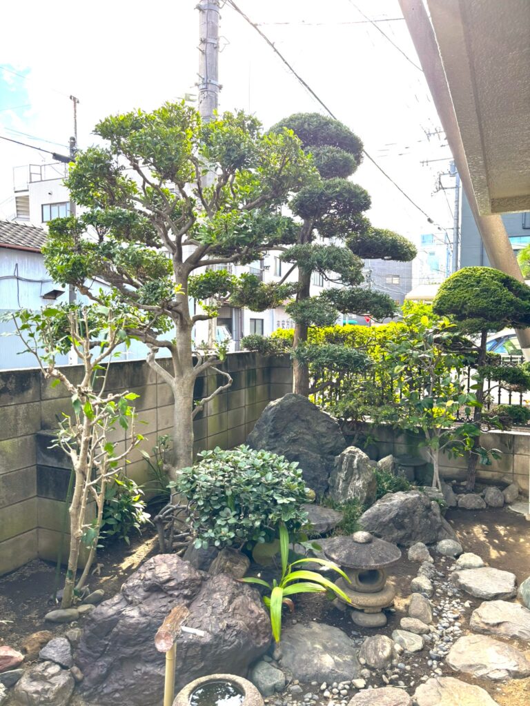 左写真:チャボヒバ、マキ、モチノキ、ムクゲのお手入れ